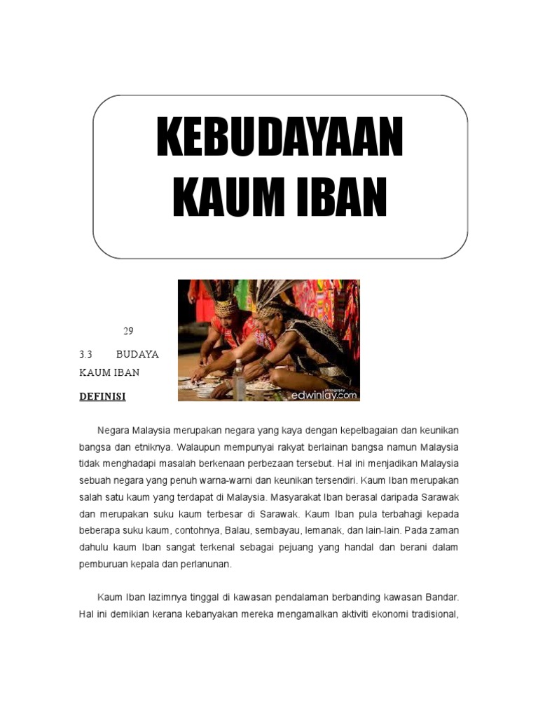 Iban dalam Bahasa Iban bermaksud orang atau manusia adalah kaum Peribumi asli yang tinggal di pulau Borneo. Kaum majoriti di Sarawak meliputi orang IbanDayak Laut orang Melayu dan Melanau. Masyarakat Iban sekarang masih mengekalkan nilai adat resam dan ciri-ciri kebudayaan yang menjadi lambang tradisi masyarakat Iban walaupun kebanyakan masyarakat Iban pada hari ini menerima agama Kristian sebagai pegangan.