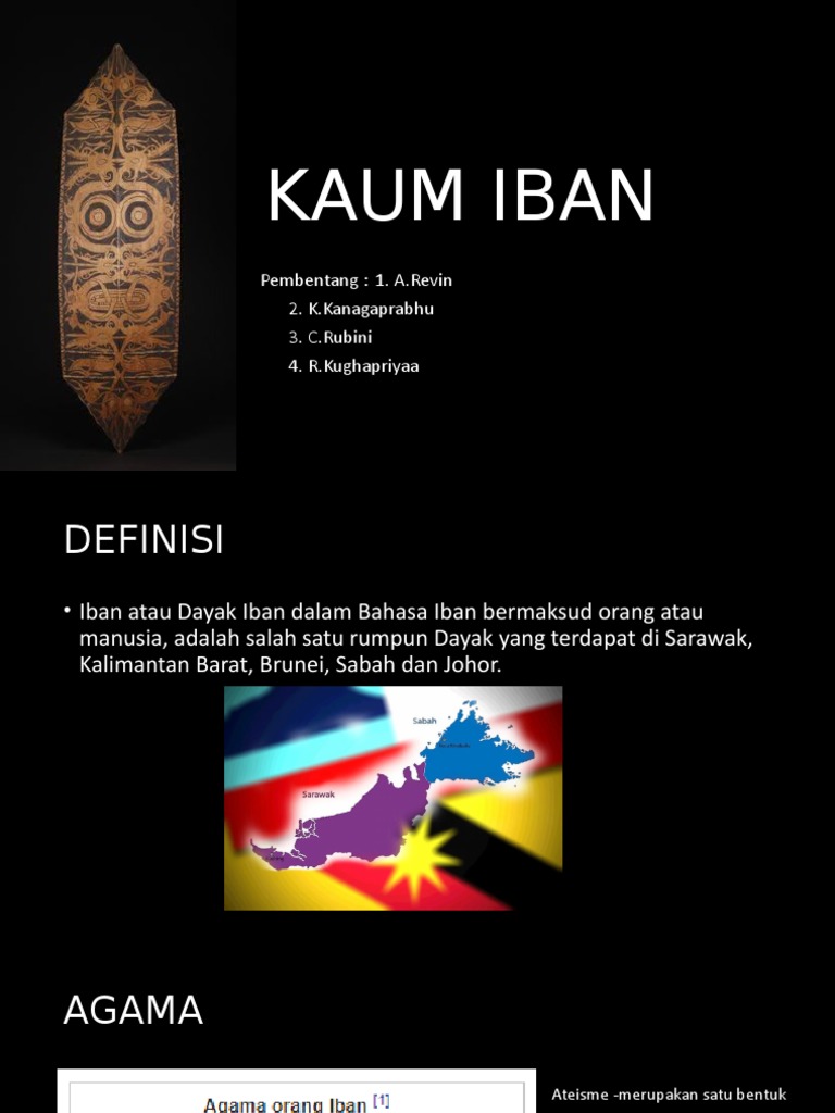 The Iban language jaku Iban is spoken by the Iban a branch of the Dayak ethnic group formerly known as Sea Dayak. Pantang larang ialah peraturan larangan yang lazim biasa diikuti oleh sesuatu bangsa sejak. Rata-rata kaum Iban di Sarawak telahpun menerima agama sejak kedatangan pengaruh agama di Sarawak iaitu majoriti daripada mereka adalah penganut agama Kristian dan selebihnya menganuti agama Islam.